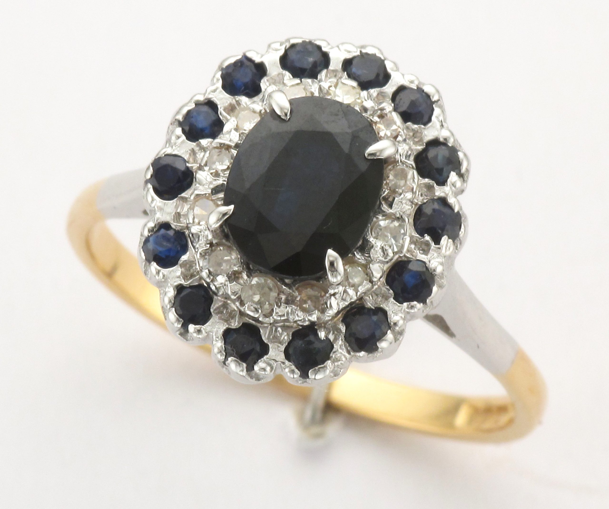 Ladies 18ct Gold 27-Stone Oval & Round Cut Sapphire & Eight Cut Diamond Claw Set 3-Tier Oval Cluster Ring – Ring Weight: 5.1 Grams – Diamond Weight: 0.15ct (Estimated) – Ring Size: T 1/2