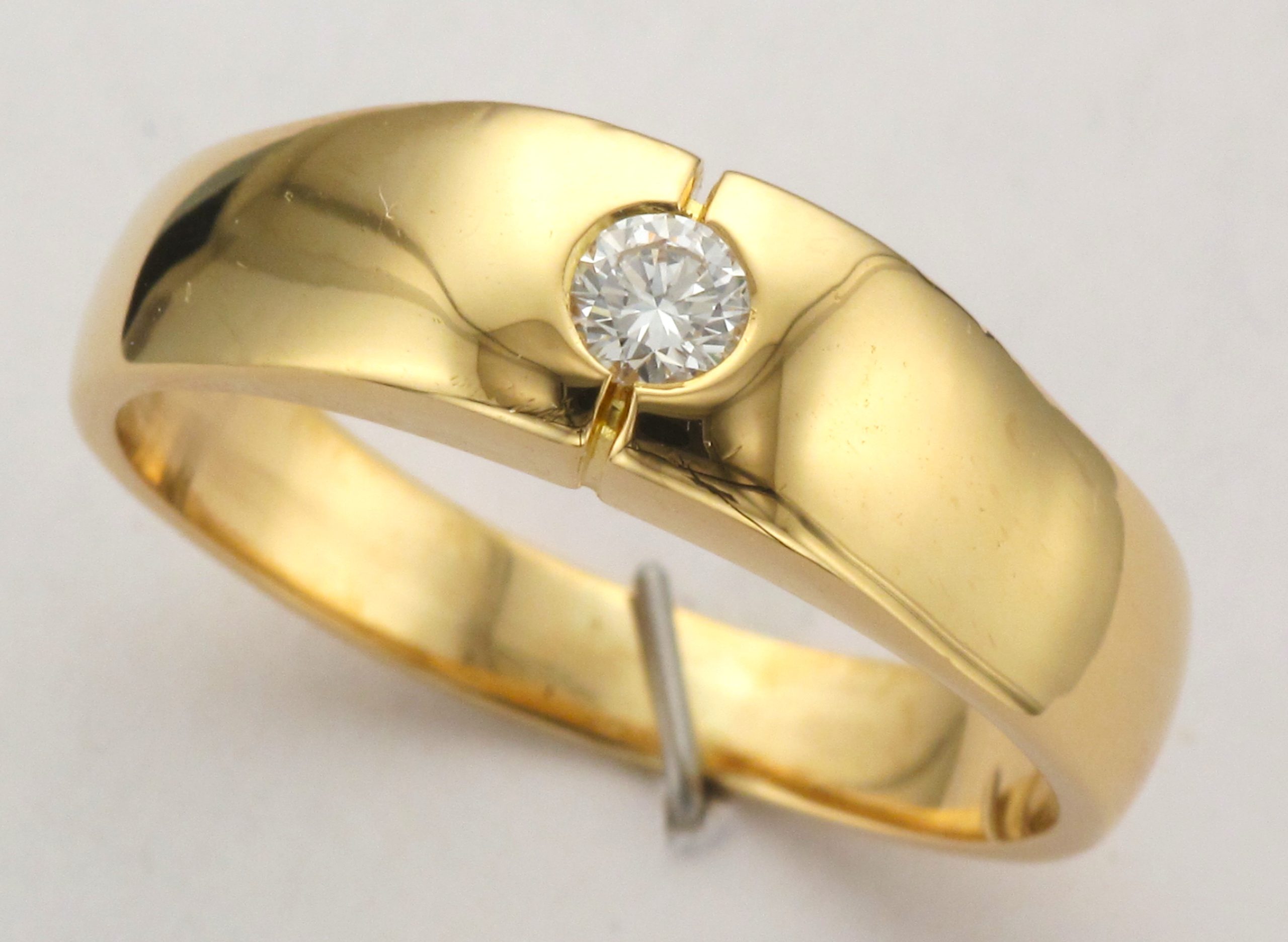 18ct Gold Single Stone Round Brilliant Cut Diamond Split Rub Over Set Graduated Band Ring – Ring Weight: 9.3 Grams – Diamond Weight: 0.25ct (Estimated) – Ring Size: W 1/2