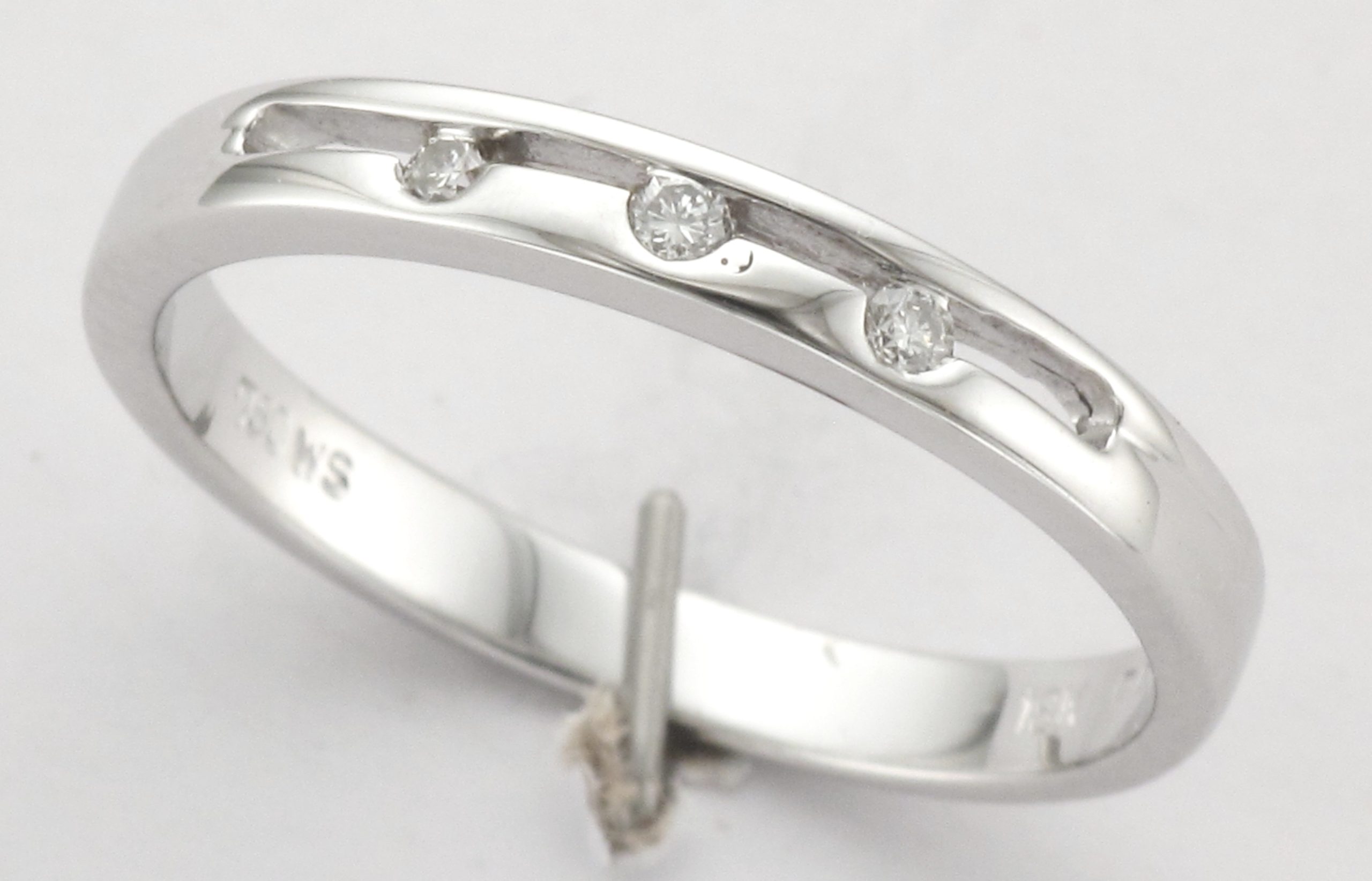 18ct White Gold 3-Stone Round Brilliant Cut Diamond Open Channel & Rubover Set Plain Polished Band Ring – Ring Weight: 2.3 Grams – Total Diamond Weight: 0.06ct – Ring Size: L 1/2