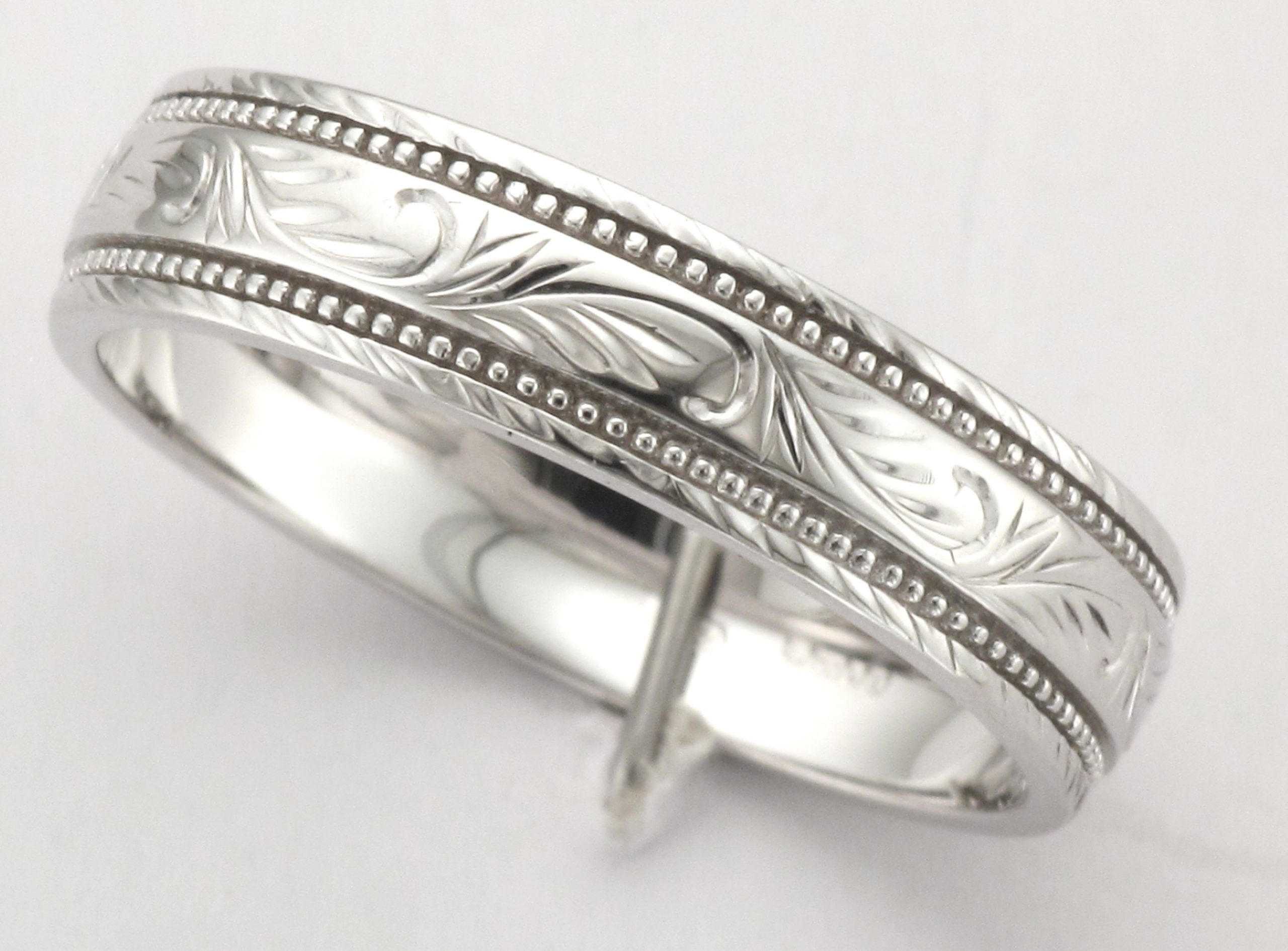 18ct White Gold 5mm Gauge Bead & Engraved Floral Pattern Wedding Band Ring – 4.4 Grams – Ring Size: Q