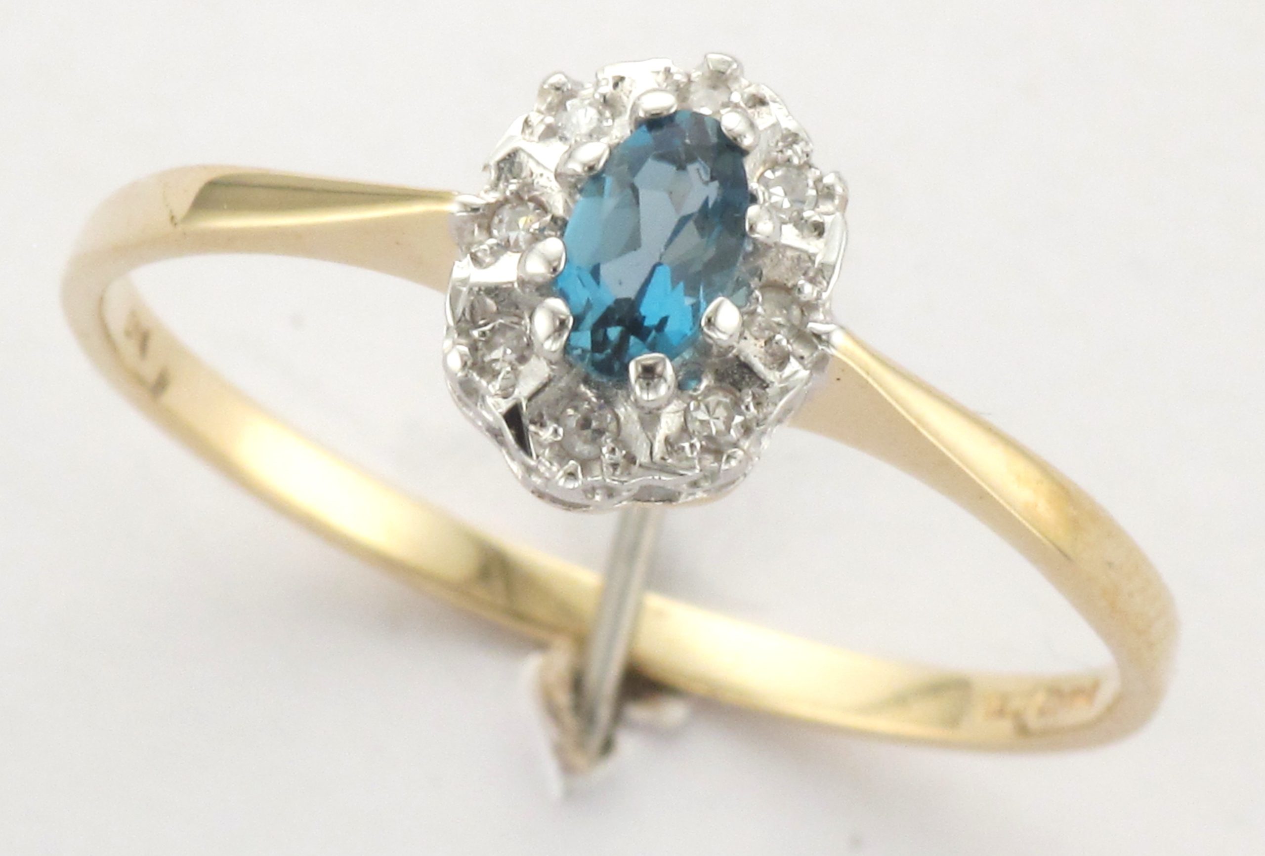 Ladies 9ct Gold 9-Stone Oval Cut Blue Topaz 8x Claw Set & Eight Cut Diamond Illusion Set 2-Tier Oval Cluster Ring – Ring Weight: 1.5 Grams – Diamond Weight: 0.04ct – Ring Size: S 1/2