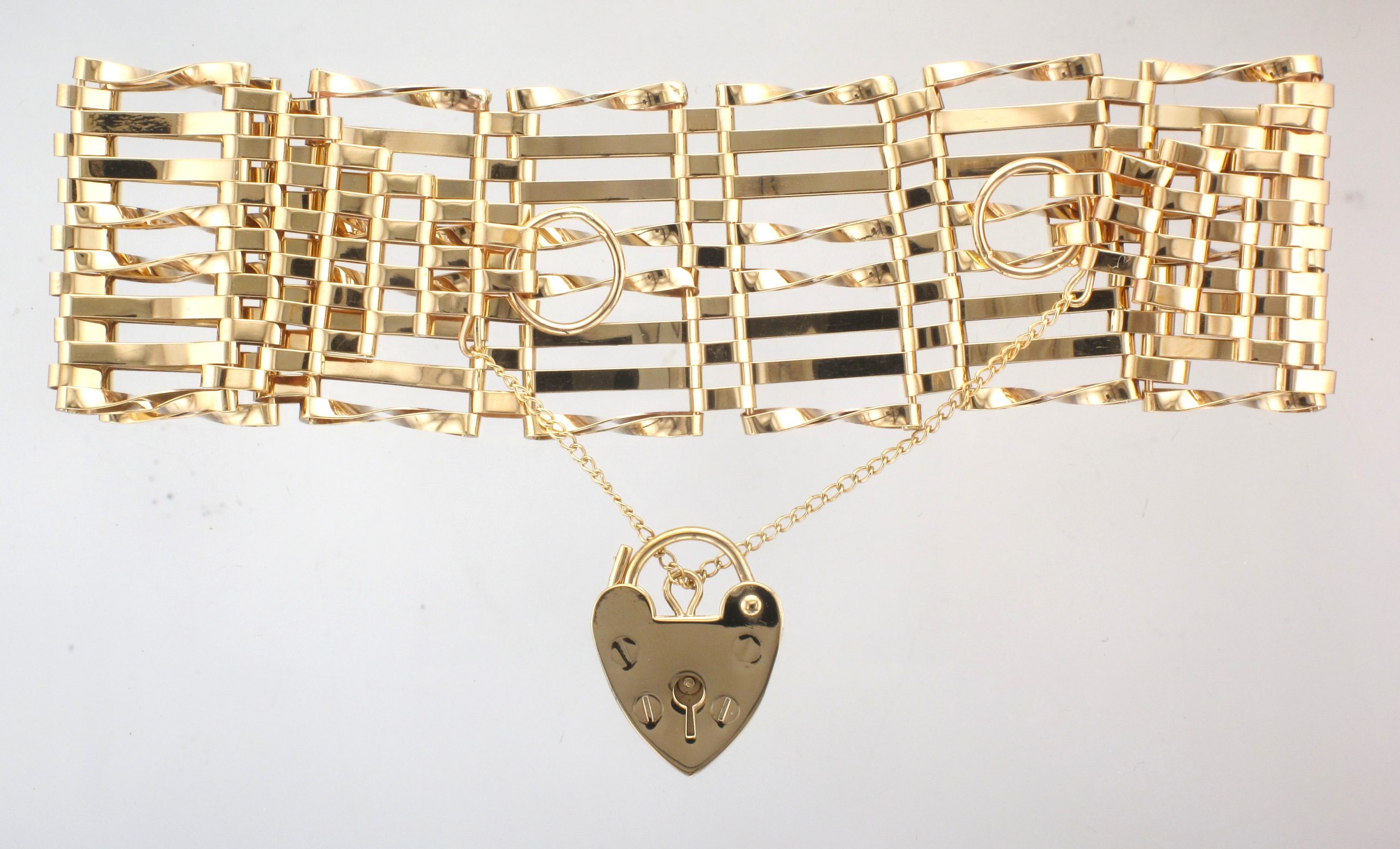 9ct Gold 7″ 27.7mm Gauge 8-Bar Plain Twist Gate Bracelet With A Padlock & Safety Chain – 16.4 Grams