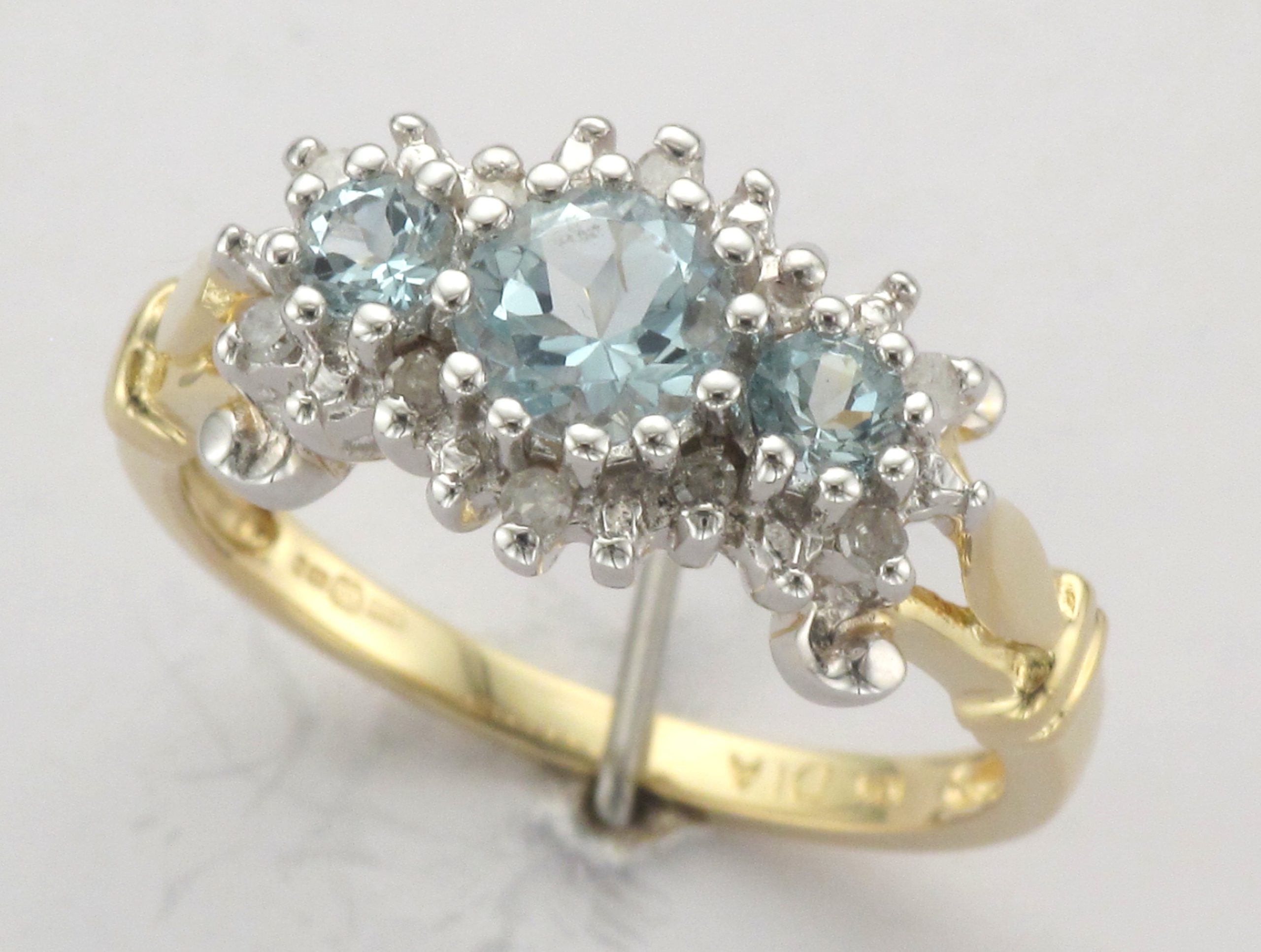 Ladies 9ct Gold 13-Stone Round Cut Blue Gem & Eight Cut Diamond 2-Tier Oblong Cluster Ring With Ribbed & Marquise Pattern Shoulders – Ring Weight: 3.0 Grams – Diamond Weight: 0.05ct – Ring Size: L