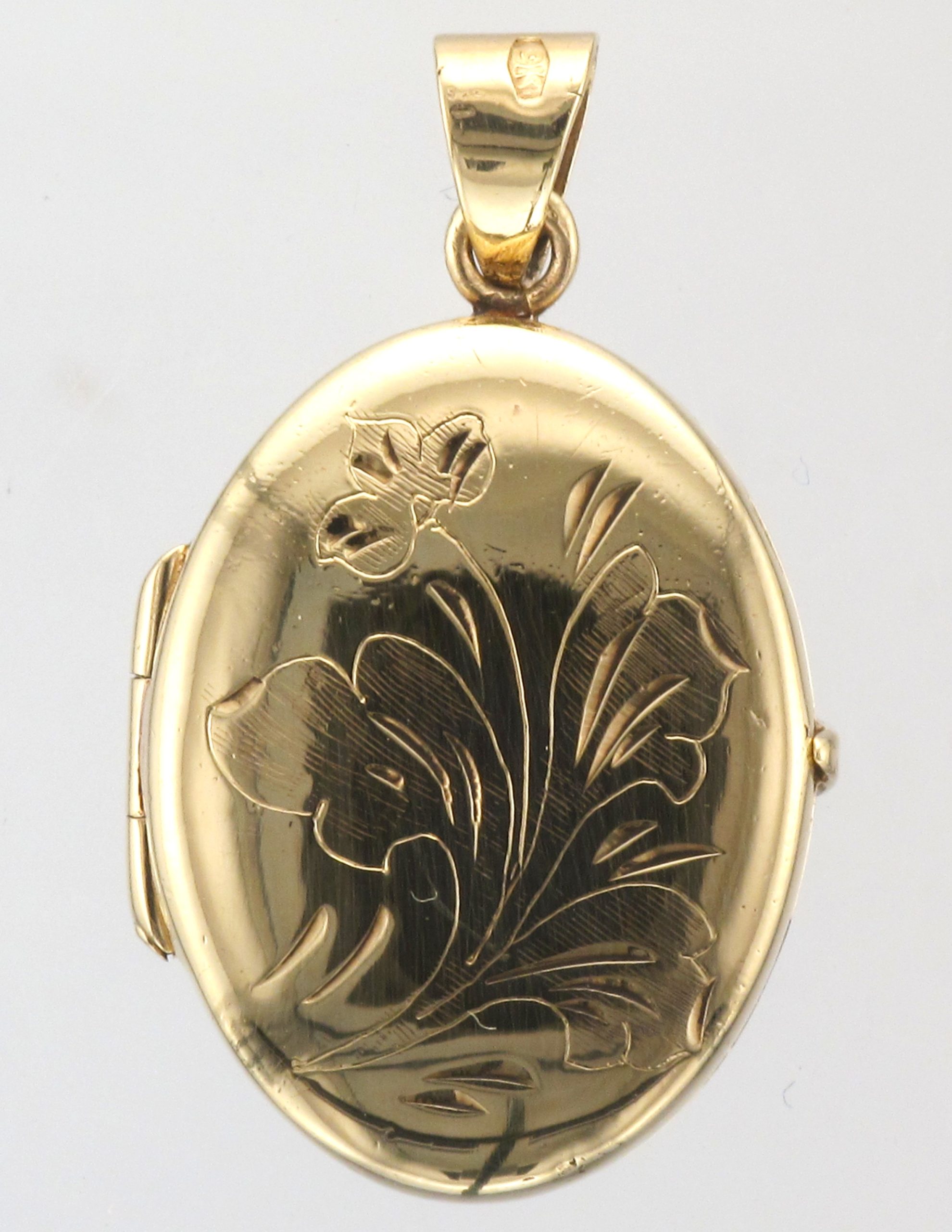 9ct Gold Floral Engraved Oval Locket Pendant With A V Bail – Total Weight: 3.5 Grams – Dimensions: 15mm (Width) x 27mm (Height)