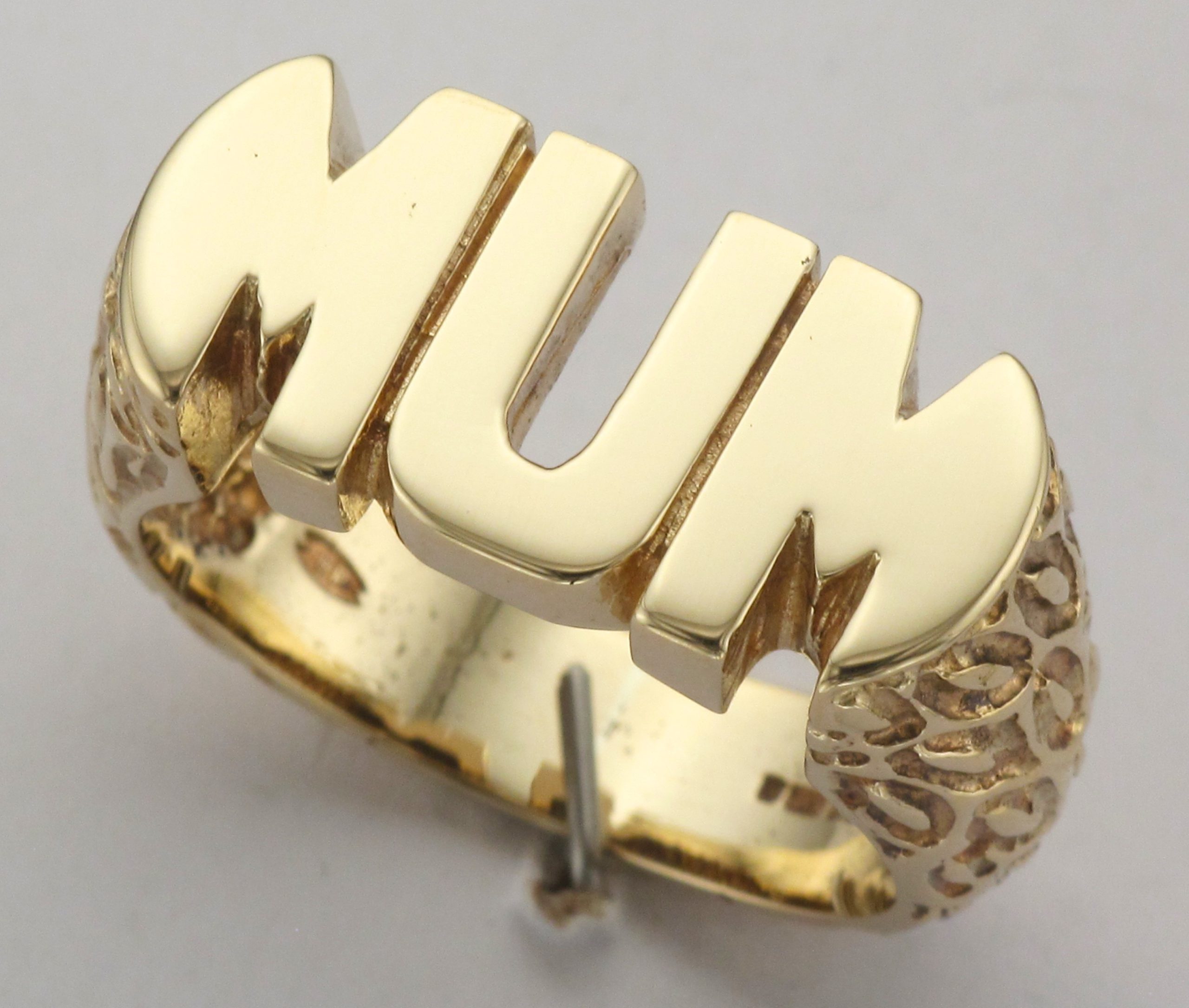 Ladies 9ct Gold MUM Rounded Top Ring With Bark Pattern Rounded Shoulders – 13.2 Grams – Ring Size: Q 1/2