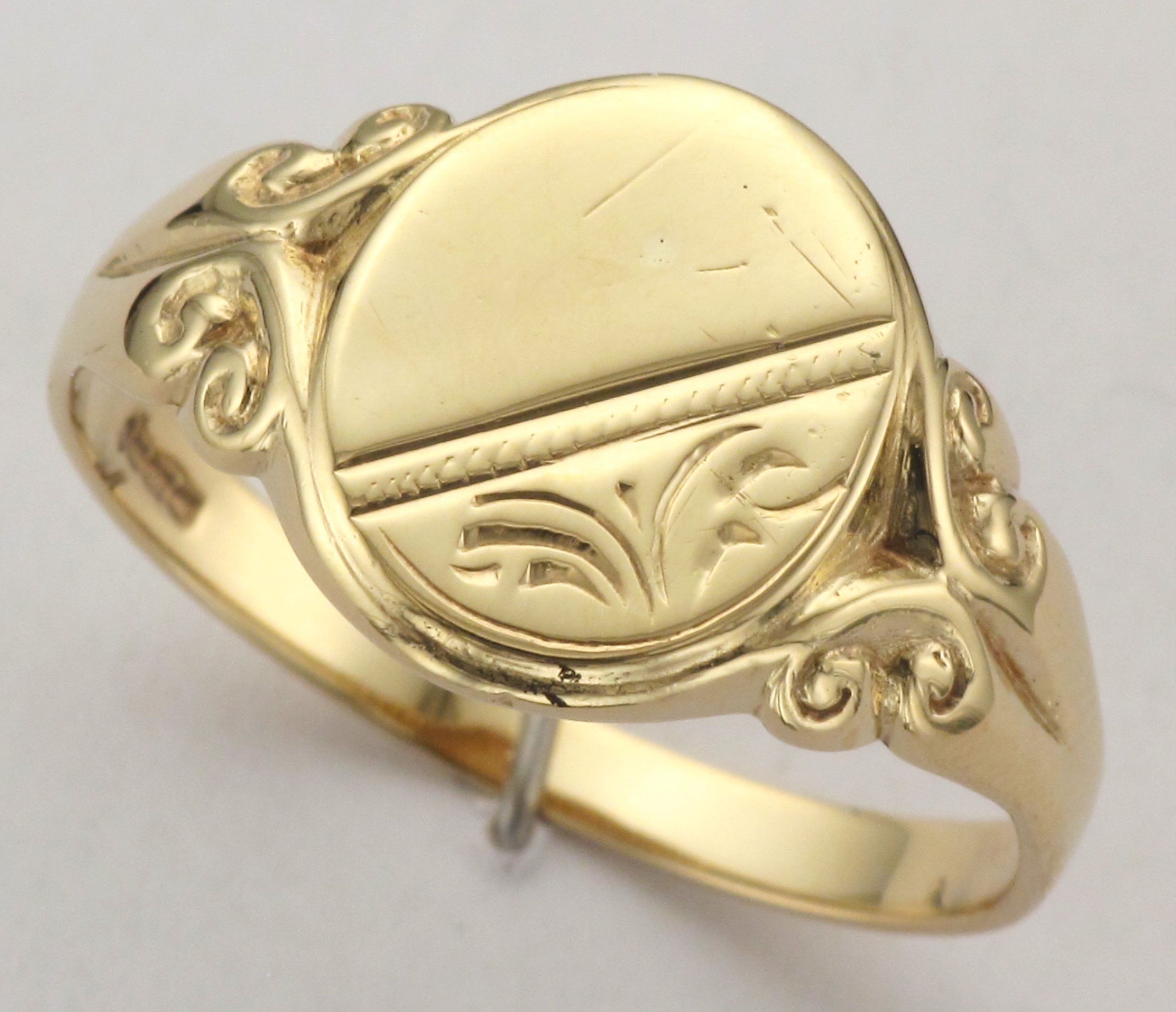 9ct Gold Oval Plain & Half Scroll Engraved Pattern Oval Signet Ring With Scroll Design Shoulders – Weight: 3.4 Grams – Ring Size Z
