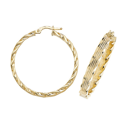 9ct Yellow Gold Pair 35mm Round Flat Twist Lined Pattern Hoop Hinged Earrings – Weight: 2.2 Grams – Diameter: 35mm – Width: 4mm