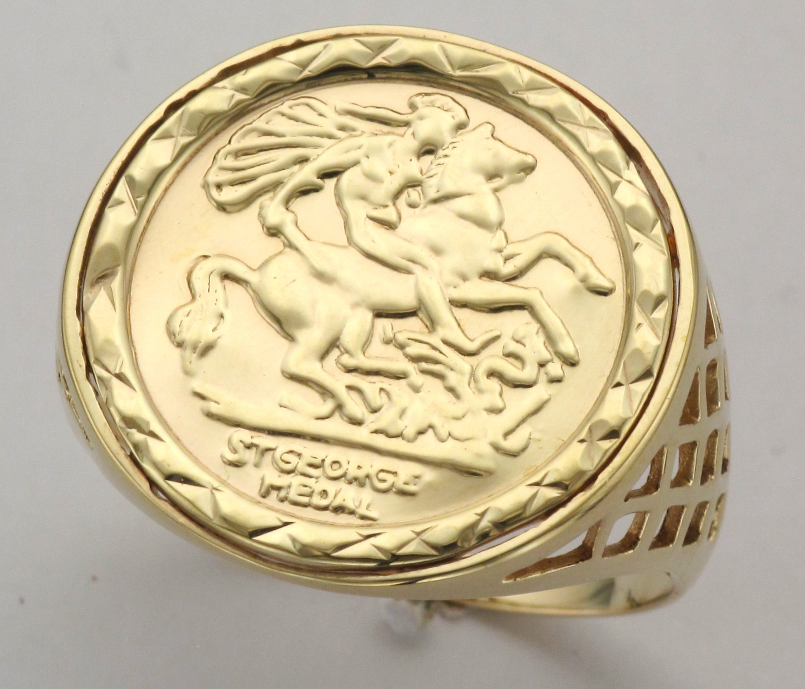 9ct Gold Diamond Cut Pattern Round Mounted St George Coin Ring With Open Lattice Shoulders – 3.9 Grams – Ring Size: V
