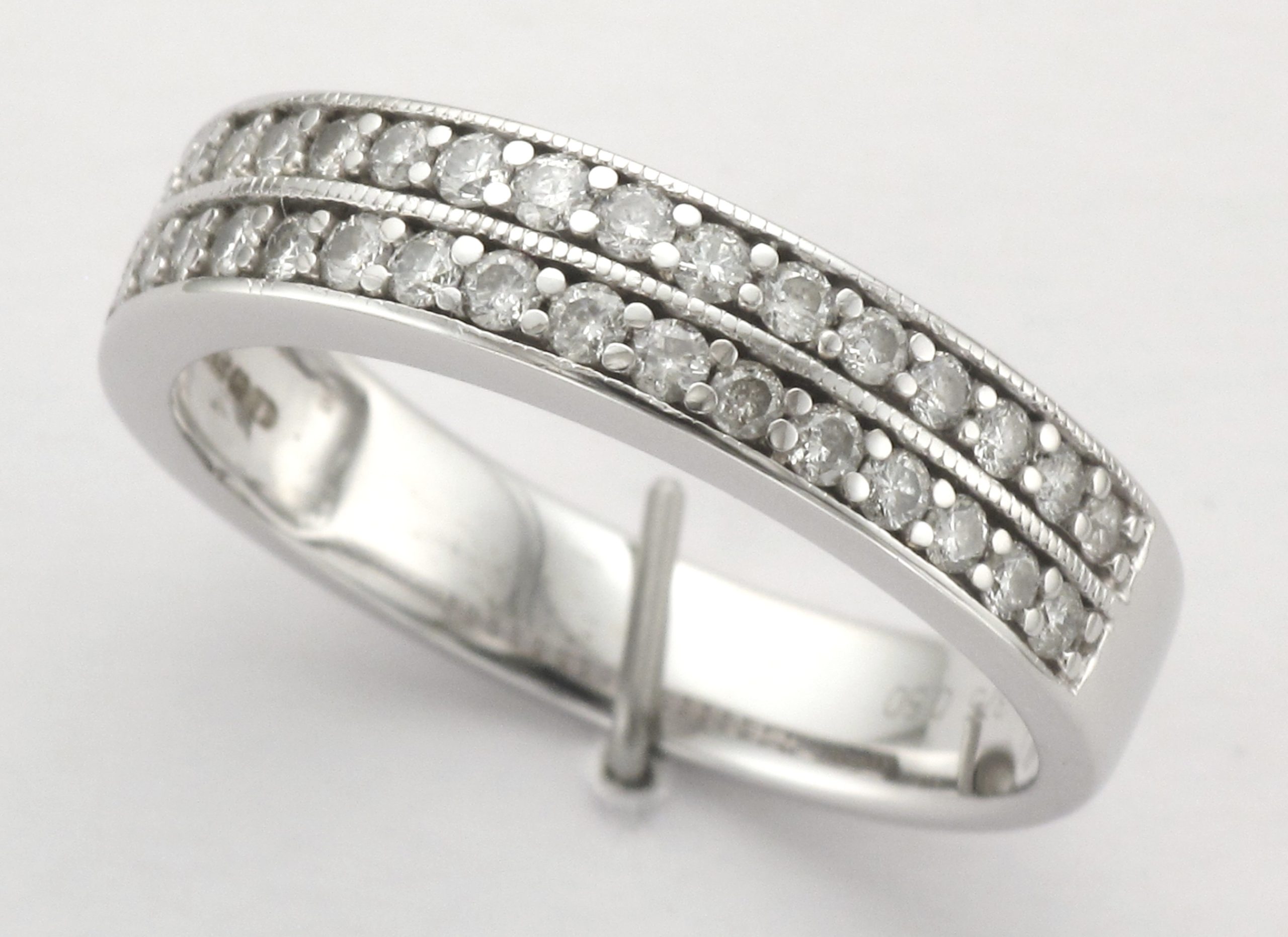 9ct White Gold 2-Row 34-Stone Round Brilliant Cut Diamond Claw Set 2-Row Band Ring – Ring Weight: 3.9 Grams – Diamond Weight: 0.50ct – Ring Size: O