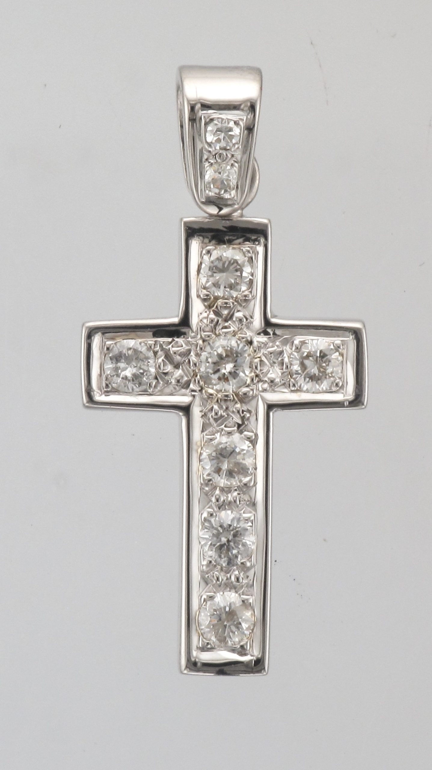 9ct White Gold 9-Stone Round Brilliant Cut Diamond Claw Set Block Cross Pendant With A 2-Stone Eight Cut Diamond V Bail – Cross Weight: 2.5 Grams – Diamond Weight: 0.35ct (Estimated) – Dimensions: 12.9mm (Width) x 27.5mm (Height)