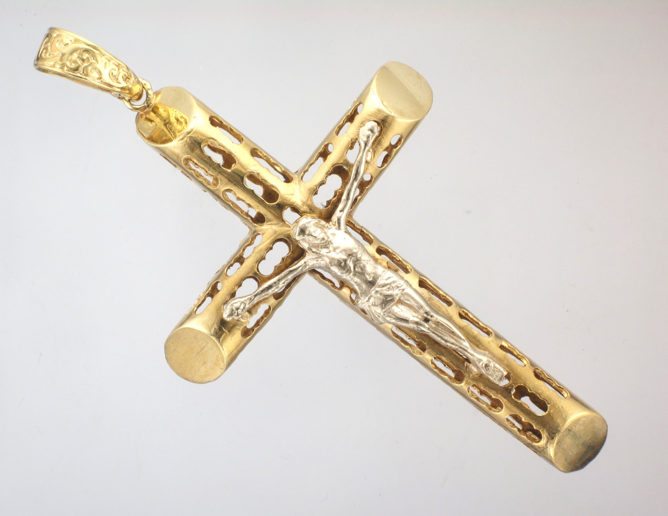 9ct Yellow & White Gold Hollow Bevelled Tubular Oblong Cut Out Pattern Crucifix Pendant With A V Bail – 16.7 Grams