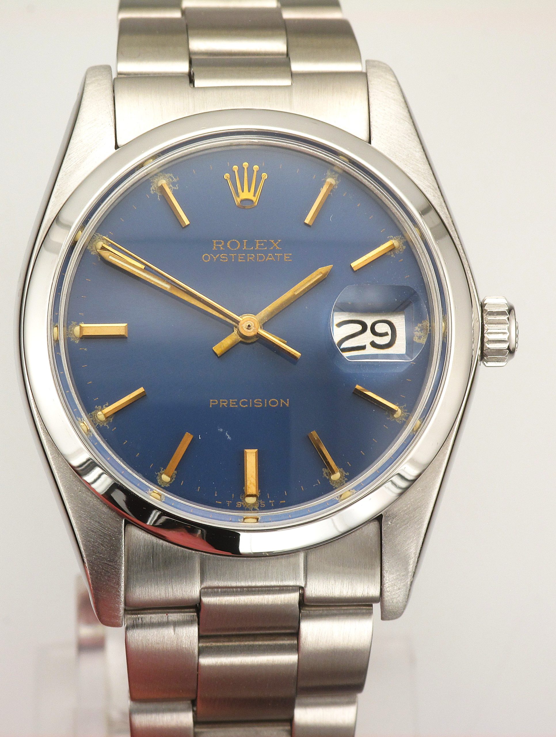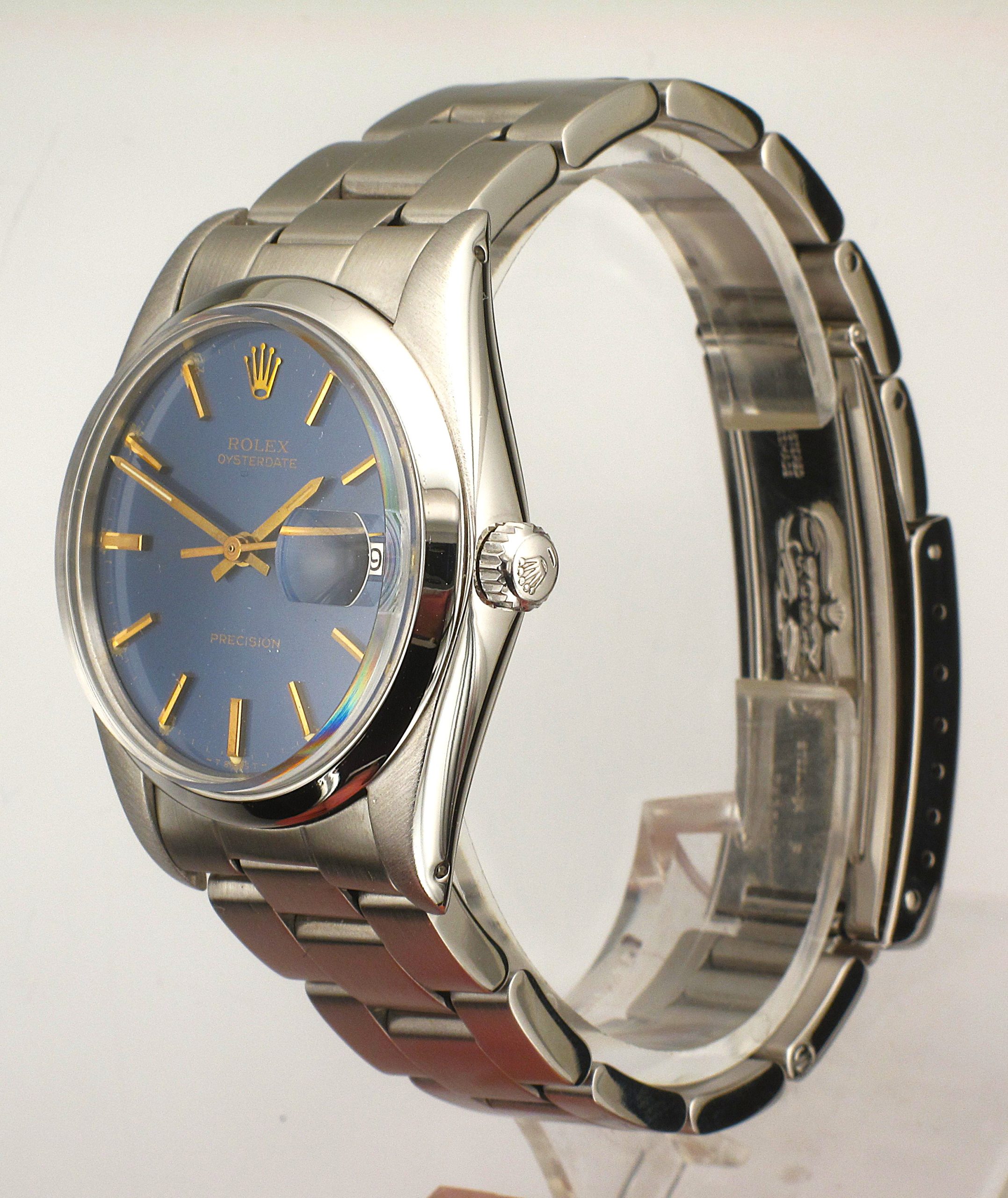 Steel (1981) Rolex 36mm Oysterdate Precision Blue Satin Gold Baton Dial Watch With Polished Bezel On A Satin Oyster Bracelet With A Deployant Clasp – Weight: 79.2 Grams – Serial Number: 665XXX – Model Number: 6694