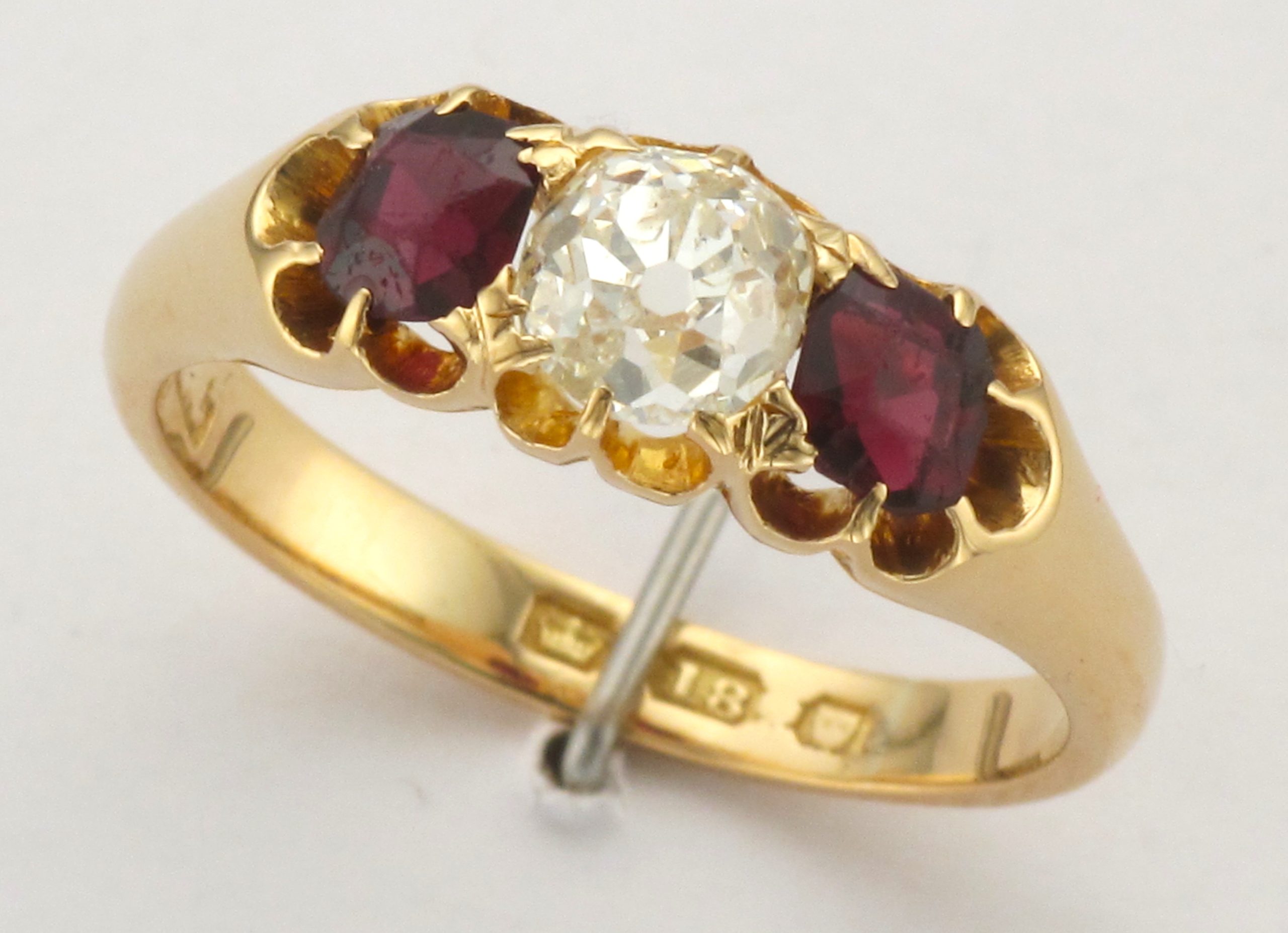 Vintage – 18ct Gold 3 Stone Diamond & Garnet Ring